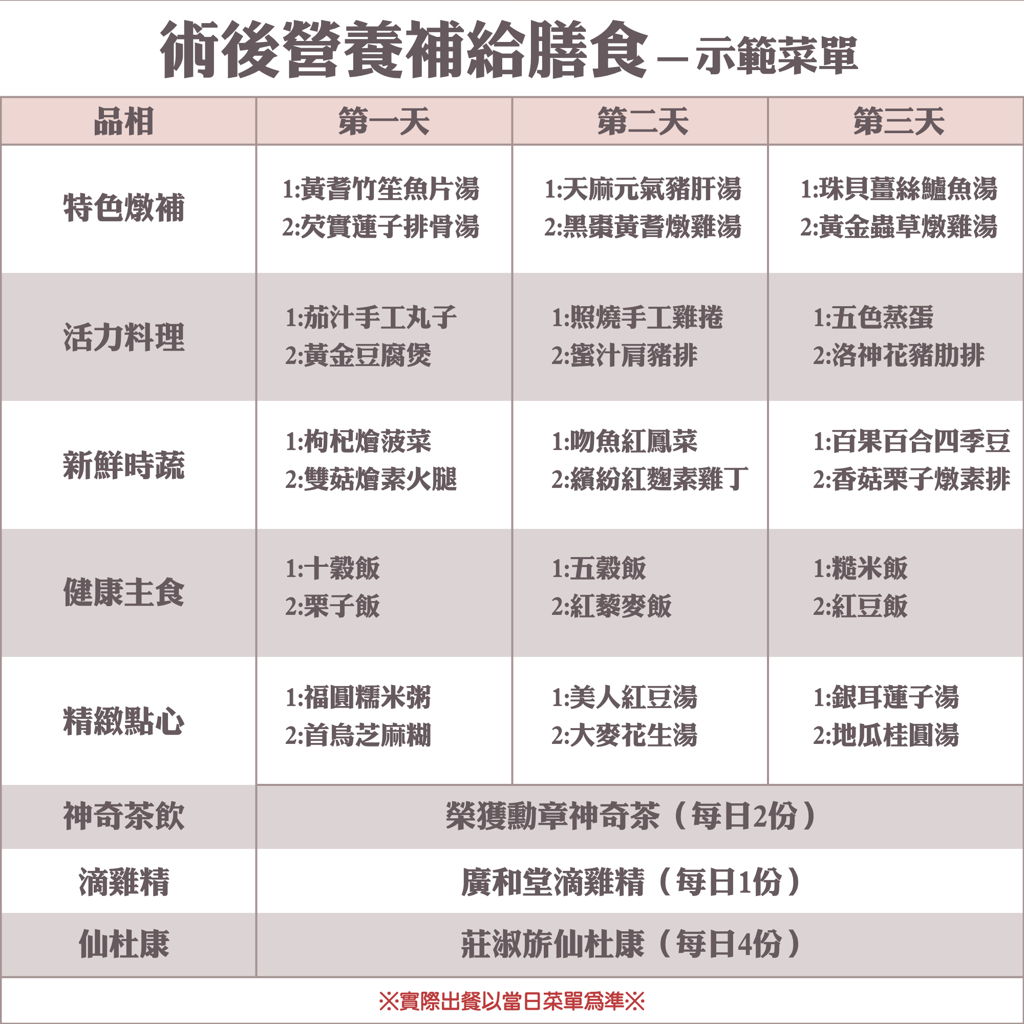 廣和以月子餐新鮮直送為傲,我們將服務範圍擴展到需要術後補養的患者,即使在住院中也能吃到新鮮的術後營養補給膳食-康養術後餐;如果在家調養,也是每日早晨配送,新鮮看的見。