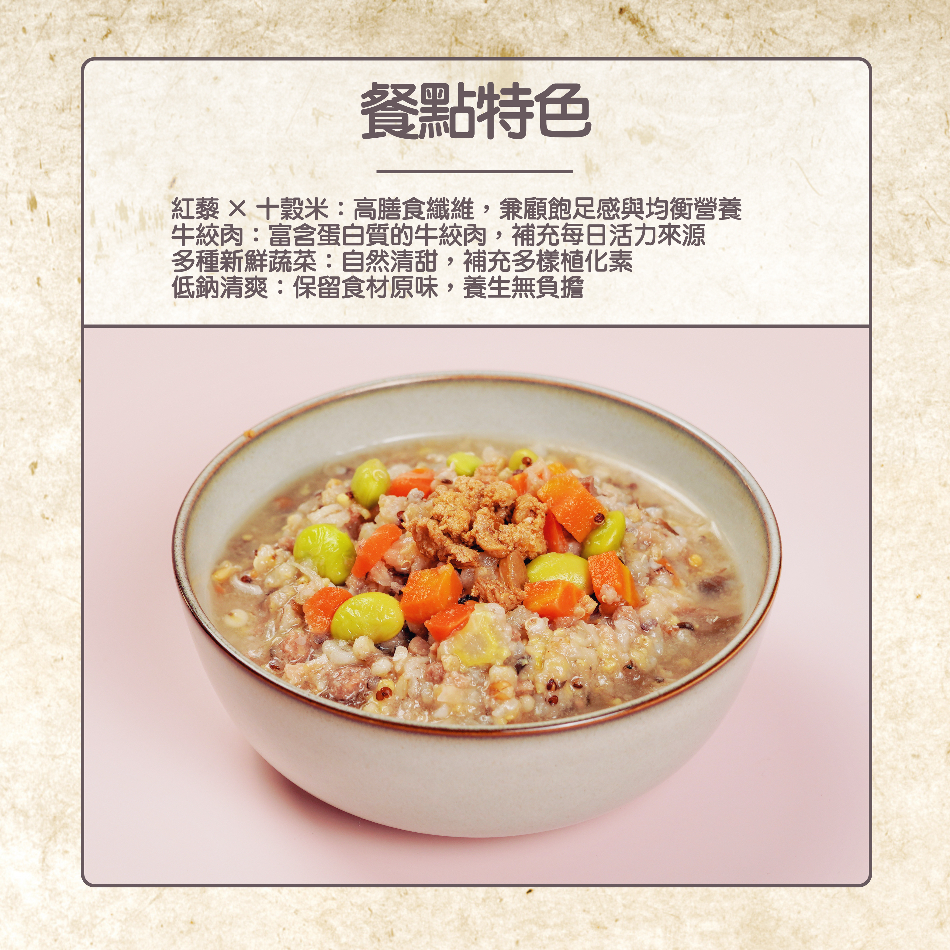延續莊淑旂博士「醫食同源」理念,選用天然食材,研發出真空冷凍粥品、炊飯與燉湯,溫和養身,天天都能享用。